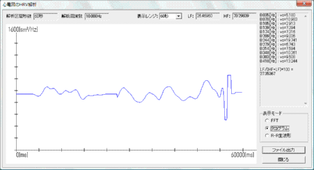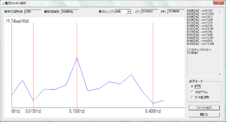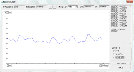 指定した範囲で心拍変動の解析、解析結果のグラフ表示(R-R間隔、タコグラム、FFT)